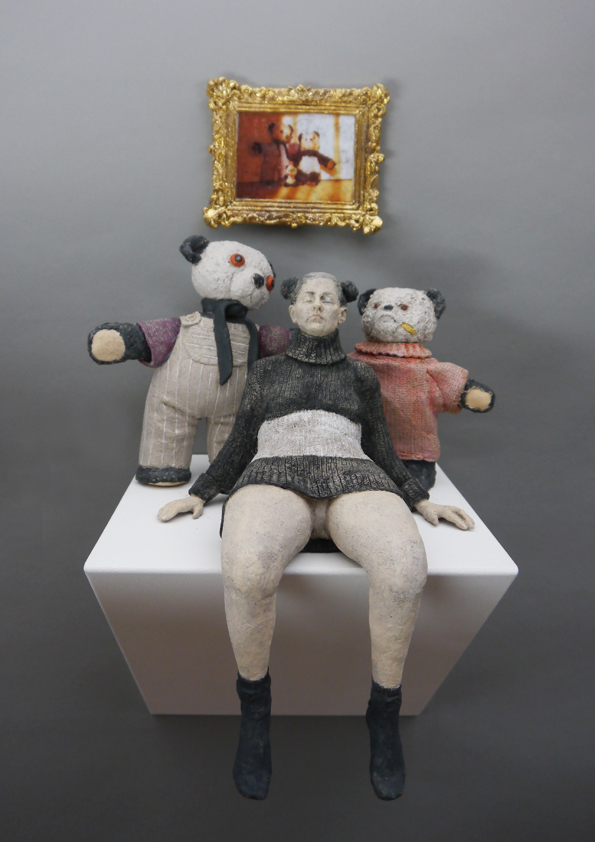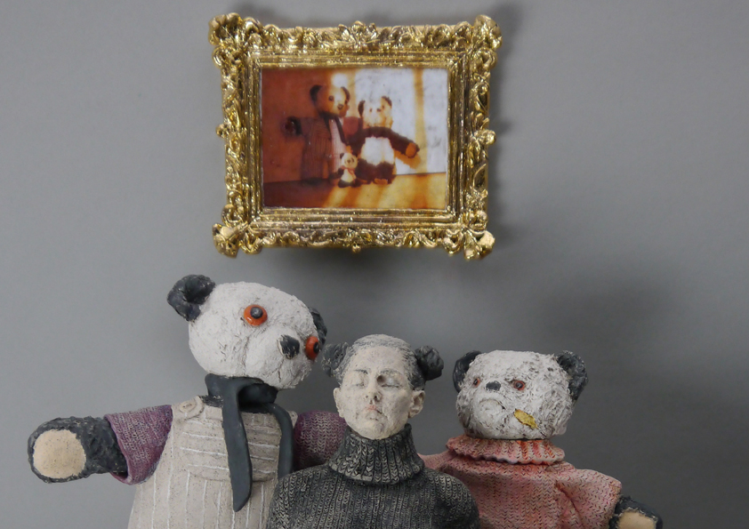 Stephanie Marie Roos, 2020, 25x 54 x 25 cm, Frame: 14,5 x 12 x 2 cm, Left bear: 18 x 18,5 x 7 cm, Woman in sweater: 21 x 16 x 19 cm, Right bear: 15 x15,5 x 6 cm, Wall socket: 25 x 36 x 25