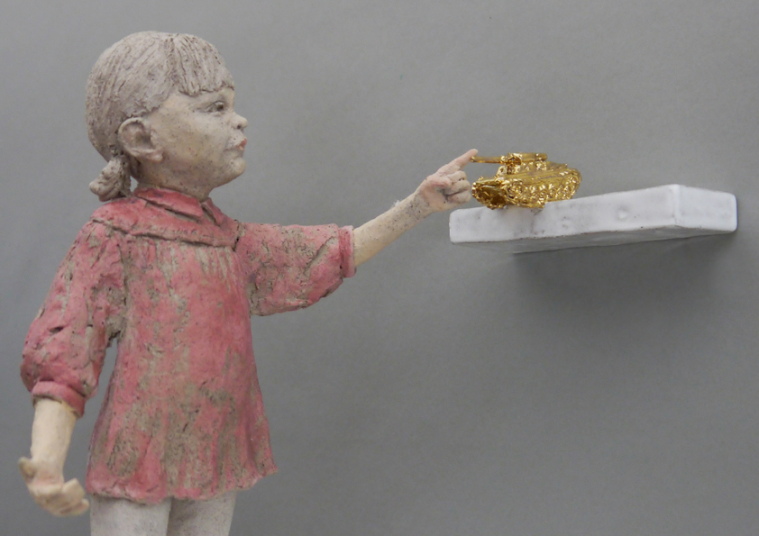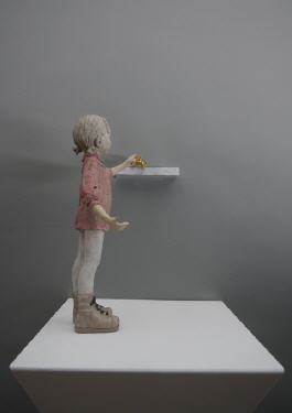 Stephanie Marie Roos, 2020, 25 x 50 x 25 cm, Wall shelf with tank: 10 x 3,5 x 6 cm, Little girl: 13 x 26 x 10 cm, Wall socket: 25 x 36 x 25